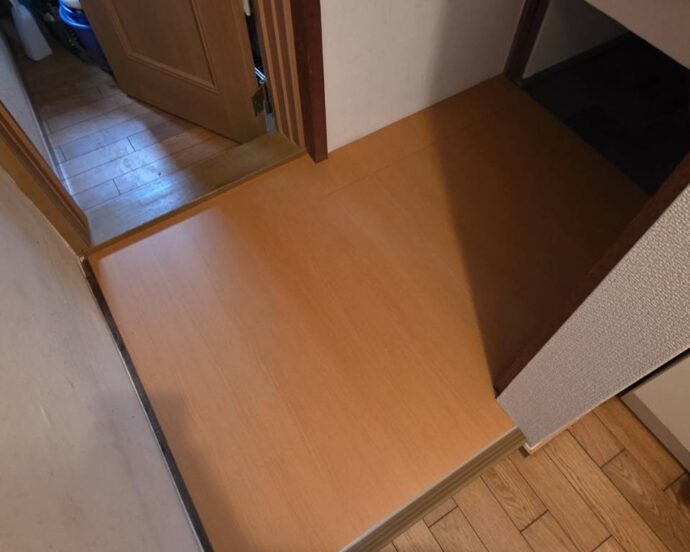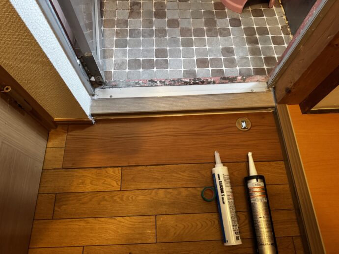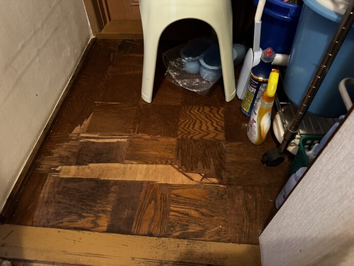 お風呂場と脱衣所の床が湿気により腐食している状況でした。↑