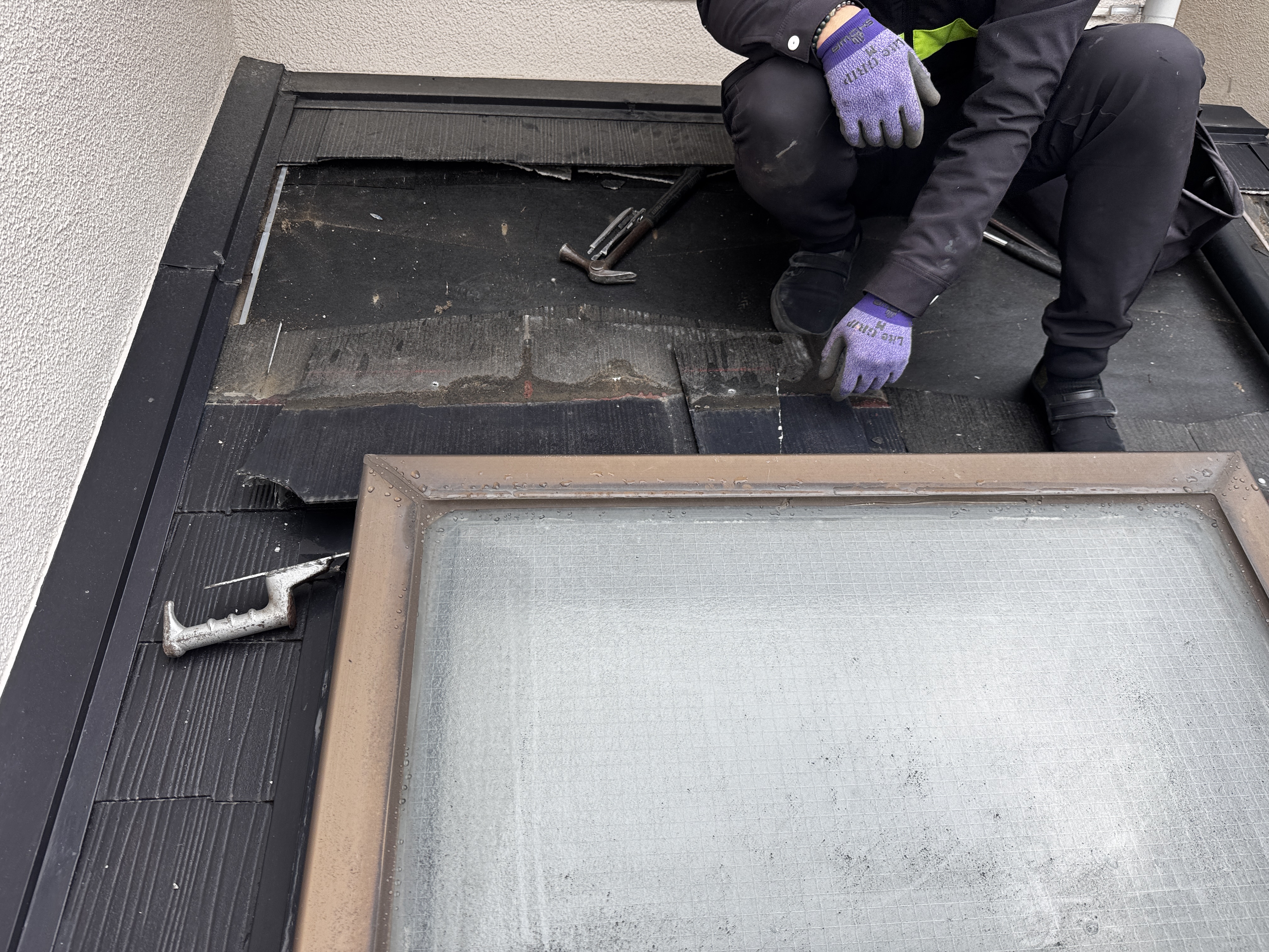 天窓回りから雨が漏れているため既存の屋根材を一部撤去します。