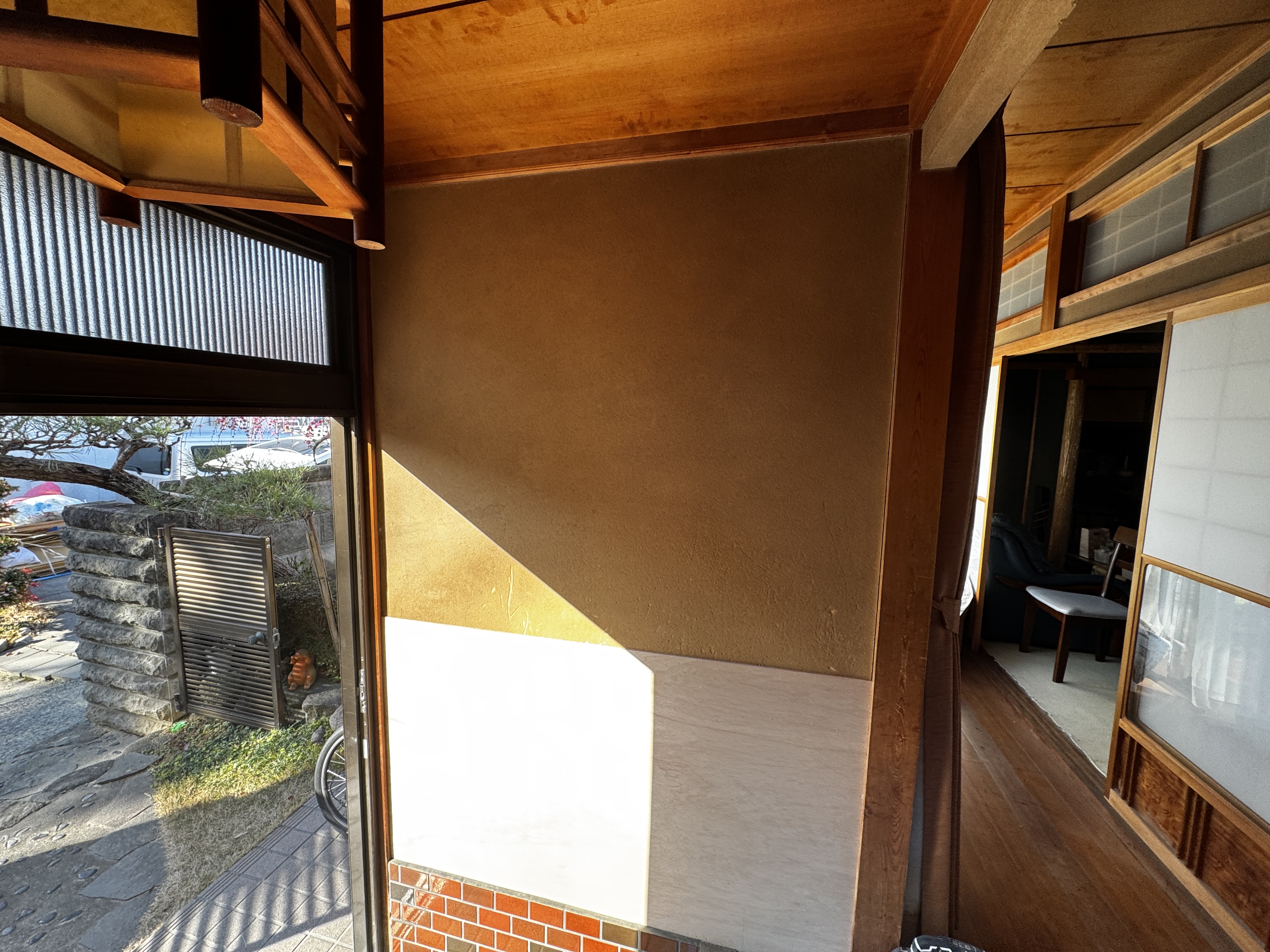 玄関の土壁が剥がれている状態です。↑